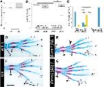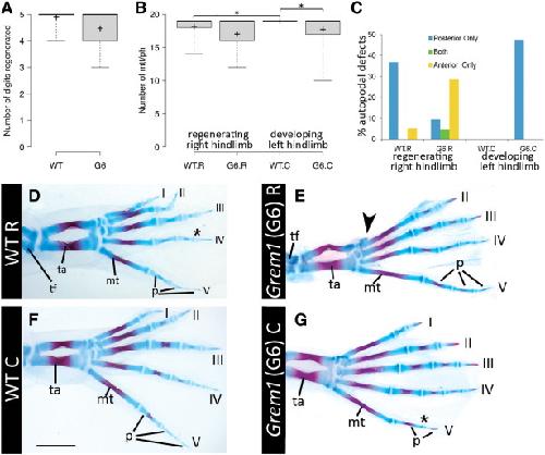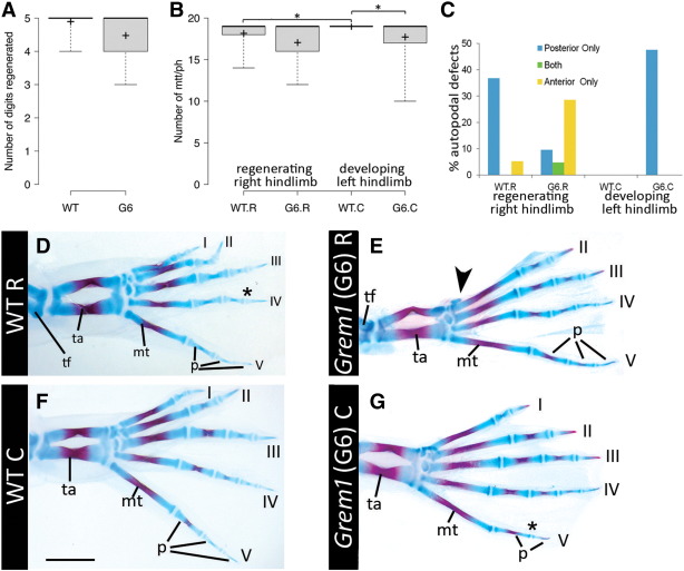 Fig. 4. Effects of grem1 overexpression on stage 52 regenerating and developing limbs. Stage 52 WT hindlimb amputation at knee level normally results in perfect or near perfect regeneration. A, B) Boxplots of the number of digits (A) or metatarsals (mtt) and phalanges (ph) (B) regenerated in WT ( = 19) vs. grem1 (G6) overexpressing hindlimbs. Centre lines show medians, box limits are 25th to 75th percentiles, whiskers extend to maximum and minimum values, and crosses indicate the sample means. Significant differences (p < 0.05) are indicated by * and determined using 2-tailed unpaired t-tests. Grem1 overexpression had little impact on regeneration in terms of the number of digits regenerated (A), or in terms of the number of mtt and ph in the autopod (B). Grem1 overexpression did have a significant effect on the developing contralateral limb (B). C) Bar graph of categorised autopodal defects. Anterior defects are more common in G6 regenerating limbs whereas the contralateral limb is more likely to show a defect in the posterior digits. DâG, skeletal preparations of representative WT and G1 hindlimbs. D) WT limbs amputated at knee level at stage 52 most commonly regenerate 5 toes, although defects can still occur: in this case a missing phalanx on digit IV (*). E) G1 amputated also most commonly regenerated 4â5 toes, in this example the black arrowhead indicates absent digit I. F) Wild type control limbautopod showing normal patterning. G) Example of grem1 overexpressing autopod with developmental defects including missing a phalange on digit V (*). Abbreviations: tf, tibiaâfibula; ta, tarsus; mt, metatarsal; and p, phalanges; roman numerals indicate digit identity.