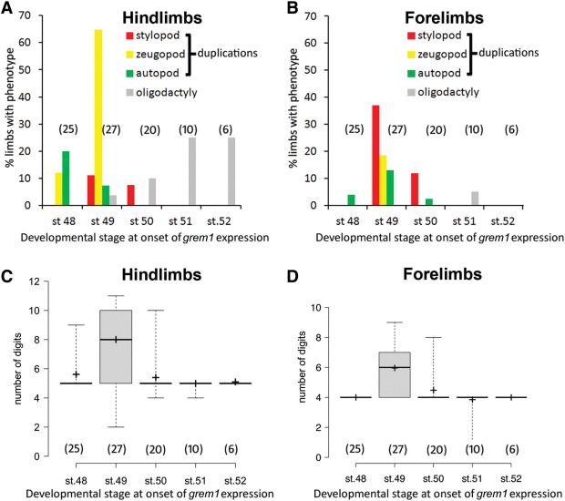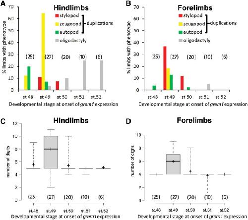Fig. 5. Phenotypes of G6 tadpoles overexpressing grem1 at different limb bud stages. A, B) Bar charts indicating the frequency of limb duplications by proximodistal level (stylopod, zeugopod or autopod) and of pattern loss resulting in fewer than expected digits (oligodactyly), when the G6 transgene is activated by heat shock at different limb developmental stages. Numbers in brackets indicate sample size/number of individual tadpoles. A) Hindlimbs and B) forelimbs. C, D) box plots showing the highest median digit number and variance occurs when grem1 is overexpressed at stage 49. Centre lines show medians, box limits are 25th to 75th percentiles, whiskers extend to maximum and minimum values, and crosses indicate the sample means for hindlimbs (C), and forelimbs (D). Statistical analysis was not attempted due to the extremely unequal variance.