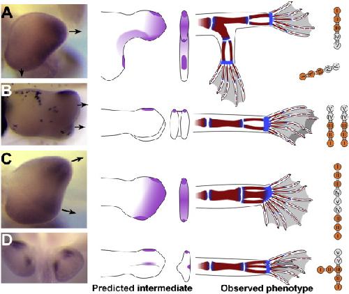 Fig. 8. Expression of hindlimbshh following overexpression of grem1 at stage 49. Shh expression (left column) at stage 51 to 52 is normally restricted to the ZPA but was very variable in grem1 overexpressed hindlimbs. Despite this, we always observed distinct anteriorposterior polarity of digits. Here, we attempt to link these patterns via predicted intermediate stages (middle two columns, side and distal view of limb stage 54) to the observed outcome phenotypes (right two columns, side view and digit identity as viewed distally). A) Zeugopod (or stylopod) duplications may arise from early dorsal budding of the limb, and expanded shh expression leading to inversion of the original limbanterior-posterior axis. B) Double autopods (side to side duplications) may arise from splitting of the ZPA, resulting in two autopods that have the same anteriorposterior orientation. C) Later branching results in polydactyly or autopod duplication through expansion of the autopod and loss of shh polarity. This also results in an inversion of polarity and an IâVâI autopod which is opposite to the phenotype of a ZPA graft to the anterior. D) Budding from the side of the original limb bud may result in a second ZPA forming perpendicular to the original, leading to partial mirroring of the autopod. Keys: Side view and distal view, purple in stage 54 predicted intermediate represents predicted shh expression intensity is represented by darker shading. Observed outcome (in terms of skeleton) for limb at metamorphosis, digit order from I (most anterior) to V (most posterior). Open circles indicate digits without a claw (posterior digits V and IV) and orange circles indicate digits with claws (anterior digits I and II and digit III). (For interpretation of the references to colour in this figure legend, the reader is referred to the web version of this article.)