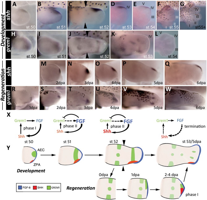 Fig. 1. Grem1 expression, relative to shh and fgf8 supports the two phase limb reciprocal signalling model of Verheyden and Sun (2008) in Xenopus. AâW in situ hybridisation (dark purple staining) of developing (AâL) and regenerating Xenopus laevis limb buds. Note that the posteriorlimb bud is uppermost as this reflects the posture in which the embryo develops; the tadpole itself is anterior to the left and dorsal uppermost, lying on its side. This orients the limbproximal to the left. Some embryos were pigmented and show black melanophores. AâG) Shh in developing limbs is localised to the ZPA, the posteriordistalmesenchyme, as previously shown. Expression appeared strongest at stage 52 and then declined up to stage 55, where it was found in digit V mesenchyme. HâL) Grem1 expression was first seen in distalmesenchyme at stage 50 (H), before becoming cleared from the mesenchyme directly under the AER by stage 51 (I). This trend continued at stage 52 (J) before gradual loss of expression in the autopod so that no transcripts were detectable by stage 54 (K, L). Black arrowheads in C and J indicate amputation site used for regenerating limb experiments and roman numerals indicate digit identity. MâQ) Expression of shh in regenerating limbs amputated at stage 52, midway through the limb bud. Shh was first detected at 2 dpa and was always localised to the posteriordistalmesenchyme under the AEC (NâQ). By 6 dpa it was starting to reduce, as the autopod re-differentiated. RâW) Grem1 expression in regenerating limb buds appeared at 1 dpa and from 2 to 4 dpa was localised in distalanteriormesenchyme, reciprocal to shh (RâU). Expression cleared from the autopod at 5â6 dpa (V, W). X) Model of Verheyden and Sun (2008) based on genetic manipulations in mice. Y) Xenopus model showing alignment with the mouse model, FGF data from Wang and Beck (2014) for fgf8. Note limb drawings have been âinvertedâ to put anterior uppermost as is the convention for amniotes, and black arrowheads indicate amputation level. Grem1 is initially directly in contact with the AER and a positive feedback loop is established between Grem1 and Shh in the mesenchyme and the AER FGFs. This is phase I and corresponds to stage 50 of Xenopus limb development. At stage 51, grem1 is cleared from the distalmesenchyme because fgf levels in the AER rise above the threshold required to switch on an inhibitory loop (phase II). Shh levels continue to rise but grem1 is now distant from the AER Fgfs and may fail to maintain expression (stage 52). This leads to termination of the loop starting at stage 53 and loss of first grem1 and then shh and fgf8 from the autopod. Regenerating limbs are similar although since grem1 is not cleared from the distalmesenchyme until 5 dpa, phase I may last longer, enabling extra growth required to regenerate lost structures. (For interpretation of the references to colour in this figure legend, the reader is referred to the web version of this article.)