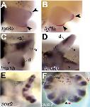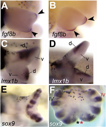 Fig. 7. Expression key marker genes for limb developmental patterning in G6 tadpole limbs. In situ hybridisation with limb patterning markers confirms that PD and DV axes are normal in branched limbs. A, B) fgf8b expression in approx. stage 51 limb buds of G6 tadpoles showing that a new AER forms in addition to the original (black arrowheads) as the limb bud bifurcates. The dorsal limb appears to be the original. C, D) Lmx1b marks the dorsal mesenchyme of the zeugopod and autopod. The bifurcated limb establishes or retains DV identity. In C, the new axis is perpendicular to the original and in D it is parallel. Mirror imaged dorsal ventral polarity was not observed. Limb bud is stage approx. 52, side view in C and stage 53, ventral view in D. E, F) sox9 expression in the forming digitcartilage of autopod duplications, stage 54. E) Side view. F) Distal (palm) view. Digit IV is indicated by roman numerals showing the mirror imaging of the AP axis VâIIâIIâV. Digit I is still forming but appears duplicated as well (*).