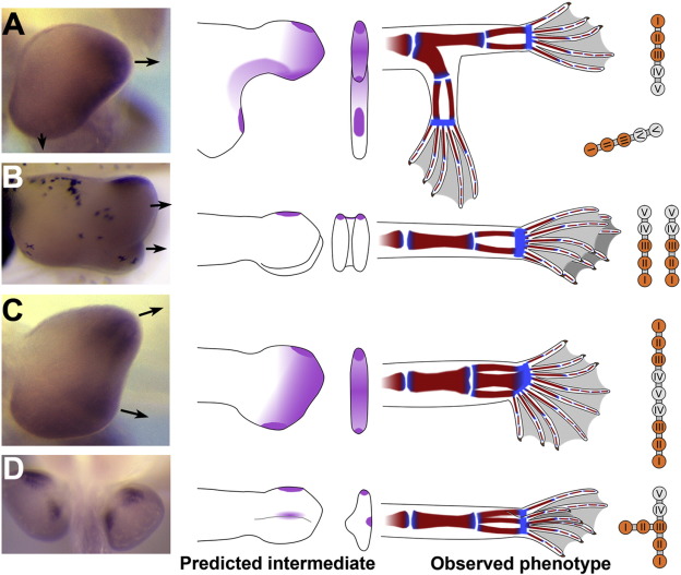 Fig. 8. Expression of hindlimbshh following overexpression of grem1 at stage 49. Shh expression (left column) at stage 51 to 52 is normally restricted to the ZPA but was very variable in grem1 overexpressed hindlimbs. Despite this, we always observed distinct anteriorposterior polarity of digits. Here, we attempt to link these patterns via predicted intermediate stages (middle two columns, side and distal view of limb stage 54) to the observed outcome phenotypes (right two columns, side view and digit identity as viewed distally). A) Zeugopod (or stylopod) duplications may arise from early dorsal budding of the limb, and expanded shh expression leading to inversion of the original limbanterior-posterior axis. B) Double autopods (side to side duplications) may arise from splitting of the ZPA, resulting in two autopods that have the same anteriorposterior orientation. C) Later branching results in polydactyly or autopod duplication through expansion of the autopod and loss of shh polarity. This also results in an inversion of polarity and an IâVâI autopod which is opposite to the phenotype of a ZPA graft to the anterior. D) Budding from the side of the original limb bud may result in a second ZPA forming perpendicular to the original, leading to partial mirroring of the autopod. Keys: Side view and distal view, purple in stage 54 predicted intermediate represents predicted shh expression intensity is represented by darker shading. Observed outcome (in terms of skeleton) for limb at metamorphosis, digit order from I (most anterior) to V (most posterior). Open circles indicate digits without a claw (posterior digits V and IV) and orange circles indicate digits with claws (anterior digits I and II and digit III). (For interpretation of the references to colour in this figure legend, the reader is referred to the web version of this article.)