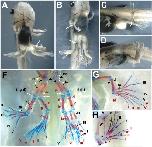 Fig. 6. Phenotypes arising from overexpression of grem1 in G6 F1 tadpoles that have been heat shocked to activate transcription of grem1 at stage 49. AâD) G6 tadpoles at stage 58, after hatching of the forelimbs. White arrows indicate examples of apparent limb bifurcation at the level of the soft tissue in G6 tadpoles where all four limbs are duplicated or bifurcated. A) Ventral view with anterior uppermost, showing complete forelimb duplications and bifurcated hindlimbs. B) A tadpole from the same cohort showing bifurcations at elbow/knee level. C) Example of bifurcated hindlimb at ankle level, side view with anterior to left. D) Example of hindlimb polydactyly, side view with anterior to left. FâH) Skeletal preparations stained with Alcian blue (cartilage) and Alizarin red (bone). Red (ventral most) and black (dorsal most) labels indicate the bones of each pair of limbs. Roman numerals indicate digit identity. F) Individual shown in B, showing complete duplication of hindlimbs articulating with a single pelvis (black arrowheads), soft tissue is joined to the level of the knee (white arrows). Note that the ventral limbs have a normal anteriorposterior polarity (VâI, IâV) while the dorsal pair have opposing polarity (IâV, VâI). The polarity of the zeugopod is also inverted in dorsal limbs. G) Individual shown in C, righthindlimb demonstrating the duplication arises at the zeugopod level (black arrowheads). H) Individual shown in D, exhibiting polydactyly and a malformed zeugopod (*). Digits red II and black V have additional bifurcations of the phalanges (IIâ², Vâ²) and â?â indicates a thickened digit where red digit IV would be expected, which may have formed by incomplete separation. Finally, digit red V is vestigial. (For interpretation of the references to colour in this figure legend, the reader is referred to the web version of this article.)