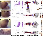 Fig. 8. Expression of hindlimbshh following overexpression of grem1 at stage 49. Shh expression (left column) at stage 51 to 52 is normally restricted to the ZPA but was very variable in grem1 overexpressed hindlimbs. Despite this, we always observed distinct anteriorposterior polarity of digits. Here, we attempt to link these patterns via predicted intermediate stages (middle two columns, side and distal view of limb stage 54) to the observed outcome phenotypes (right two columns, side view and digit identity as viewed distally). A) Zeugopod (or stylopod) duplications may arise from early dorsal budding of the limb, and expanded shh expression leading to inversion of the original limbanterior-posterior axis. B) Double autopods (side to side duplications) may arise from splitting of the ZPA, resulting in two autopods that have the same anteriorposterior orientation. C) Later branching results in polydactyly or autopod duplication through expansion of the autopod and loss of shh polarity. This also results in an inversion of polarity and an IâVâI autopod which is opposite to the phenotype of a ZPA graft to the anterior. D) Budding from the side of the original limb bud may result in a second ZPA forming perpendicular to the original, leading to partial mirroring of the autopod. Keys: Side view and distal view, purple in stage 54 predicted intermediate represents predicted shh expression intensity is represented by darker shading. Observed outcome (in terms of skeleton) for limb at metamorphosis, digit order from I (most anterior) to V (most posterior). Open circles indicate digits without a claw (posterior digits V and IV) and orange circles indicate digits with claws (anterior digits I and II and digit III). (For interpretation of the references to colour in this figure legend, the reader is referred to the web version of this article.)