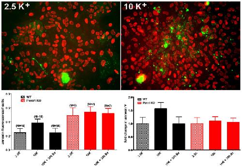 Figure 7. AnnexinV staining in astrocytes. (Top) Examples of epifluorescence images of cultured WT astrocytes treated for 1â2â hr with 2.5 and 10â mM K+- ACSF showing staining for Annexin V (green) and Dapi (red). (Bottom) Mean ± s.e.m. values of Annexin V fluorescence per total number of nuclei (left) and the mean ± s.e.m. fold changes in Annexin V (right) obtained for WT and Panx1 KO exposed to 2.5â mM K+-ACSF and to 10â mM K+-ACSF in the absence and presence of 300â µM BzATP. In parentheses are the number of images used for measurements that were obtained from 2 Panx1KO and 3 WT mice. Note that although not significant, there was a slight increase in Annexin V as measured in WT astrocytes exposed to 10â mM K+-ACSF. To avoid any bias, we measured total fluorescence and divided by cell number. This procedure results in an underestimation of K+-induced cell death because of a few dead cells in the control condition that were highly fluorescent.
