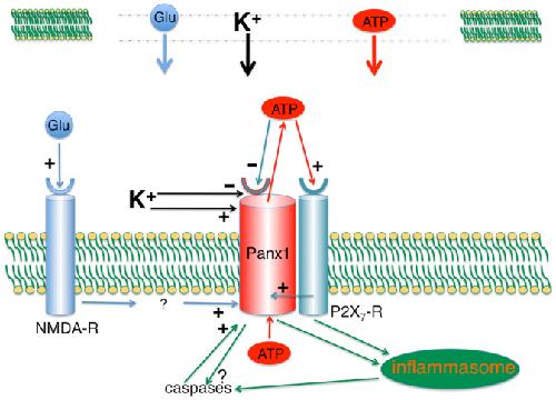 Figure 9. Early signaling events in cell undergoing secondary cell death.In the central nervous system, damaged cells (top) release ATP, glutamate and K+ into a narrow extracellular space and thus can reach concentrations approximating those in the cytoplasm. Extracellular ATP binds to purinergic receptors, including P2X7R, activating it and also activating the Panx1 channel through intracellular signaling cascade3334. ATP efflux through the Panx1 channel15 then provides a positive feedback for P2X7R activation. Under normal circumstances this positive feedback would be interrupted by the inhibition of the Panx1 channel by extracellular ATP161841. Increased [K+]o renders this negative feedback loop ineffective as shown in the present study. In addition, [K+]o stimulates Panx1 directly7. P2X7R and/or Panx1 signal to the inflammasome and thereby activate caspase-1712. In addition, caspase-3 gets activated through an unknown pathway (present study). Panx1 is a substrate of caspase-3 and its cleavage results irreversibly in constitutive channel activity27. Cell death thus is a combination of apoptotic events combined with the rundown of all membrane gradients for small molecules due to the permanently active Panx1 channel.