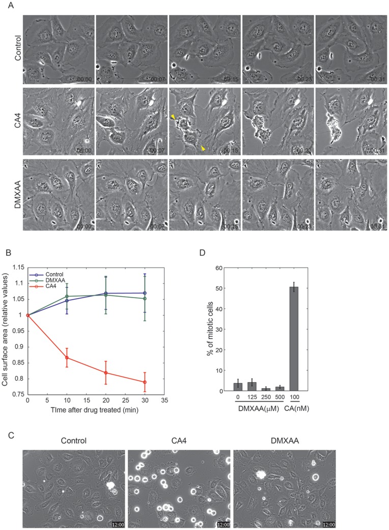 Figure 1. DMXAA does not induce any morphological changes in HUVEC cells whereas CA4 treated cells immediately contract.(A) Images were collected from phase contrast time-lapse movies at indicated times. Original time-lapse imaging was taken every 30 sec for an hour in the presence of 500 µM of DMXAA, 100 nM of CA4 or without drug (control). Elapsed time indicated in hours:minutes. (B) Cell edges were drawn to measure the number of pixels within the cell edges. Individual cell areas were summed to measure total cell surface area at each time point. The total cell area for each time point was normalized by time point 0. At each condition, Cell surface areas were averaged from at least 3 different stage positions. Error bars were calculated as the standard deviation from the results of 3 independent experiments. (C) Images were collected from phase contrast time-lapse movies at 12 hours after drug treatment. Asynchronously grown cells were treated with 500 µM of DMXAA, 100 nM of CA4 or without drug (control). (D) From the time-lapse image, mitotic cells were counted after 12 hours of drug treatment. At least 200 cells from 3 different stage positions were counted at each condition. Error bars were calculated as the standard deviation from the results of 3 independent experiments.