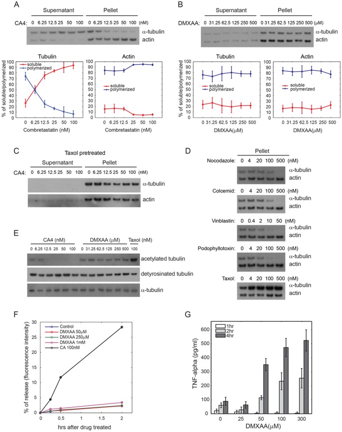 Figure 3. Quantitative analysis of the polymerization state of microtubules and actin in drug treated cells.(A) Soluble tubulin extraction assays were performed after treatment with serial dilutions of CA4 for 10 min. Tubulin and actin monomers were extracted from supernatant but polymerized tubulin and actin remained in the pellets. Each supernatant and pellet was subject to Western blotting to measure protein levels of tubulin and actin. The ratio of soluble vs. polymerized tubulin and actin are plotted in the lower panel. Error bars were calculated as the standard deviation from the results of 4 independent experiments. (B) DMXAA was treated in serial dilution for 30 min. The same experiment was performed as in (A). (C) Cells were pretreated with 300 nM of Taxol for 30 min before CA4 treatment. And soluble tubulin and actin extraction assay was performed as (A and B). (D) Various microtubule targeting drugs were treated as indicated time for 15 min and followed by soluble tubulin and actin extraction assay. And only pellets in each condition were subjected to detect polymerized actin or tubulin. (E) Cells were treated with CA4, DMXAA or Taxol as indicated concentrations and total cell lysates were analyzed by western blotting. (F) HUVEC monolayer permeability assay. Cells were grown on 3 µm pore membrane inserts for 2 days and DTAF labeled 3 k dextran (50 µg/ml) was added in insert with or without drug (control). Fluorescence intensity of the lower chamber was measured to analyze the permeability of the monolayer. The percent of released dextran was plotted as the fluorescence intensity of the lower chamber relative to the fluorescence intensity of the upper chamber intensity. (G) TNF-alpha ELISA assay. Media were collected after DMXAA treatment for various time and concentration for TNF-alpha ELISA assay. Error bars were calculated as the standard deviation from the results of 5 independent experiments.