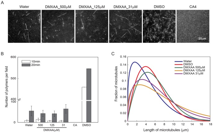 Figure 4. Comparison of the effects of CA4 and DMXAA on tubulin polymerization.Polymerized tubulin was visible by fluorescence microscopy as string like shapes. Various concentrations of DMXAA and its vehicle control (water) showed similar tubulin polymerization rates. DMSO was used as a positive control. The white scale bar indicates 20 µm. All images were taken after 20 min polymerization. (B) The number of polymers per field were counted using ImageJ. Three to ten different random stage positions were counted to measure number of polymers for each condition, except for DMSO treated were one stage position was counted. Error bars were calculated as the standard deviation from the results of 3 independent experiments. (C) The Weibull-parametrized distribution of microtubule length compared across conditions in 20 min polymerization samples. The lengths were measured using ImageJ and fit to a Weibull probability density function for each condition.