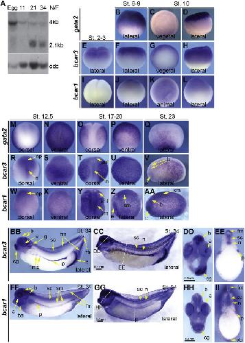 Expression patterns of gata2, bcar3 and bcar1 during Xenopus development (A) Northern analysis showing bcar3 RNA transcripts. odc was used as a loading control. All lanes are from the same blot, aligned following removal of intervening lanes (following the 2nd and 3rd lanes) using Photoshop. N/F: Nieuwkoop and Faber stages. (B-II) WMISH analysis of expression of gata2 (BâD and MâQ), bcar3 (EâH, RâV and BBâEE) and bcar1 (IâL, WâAA and FFâII) during development. For each stage, the same embryo is shown in animal, vegetal, lateral, dorsal or ventral views. The embryos in panels CC and GG were mounted in Murray's clear to visualize internal structures. Brown is pigment. All other embryos were photographed in PBS to visualize superficial structures. (DD, EE, HH and II) Transverse sections of previously stained st. 34 embryo at the level shown in panels CC and GG respectively. Np: neural plate, n: notochord, anf: anterior neural folds, b: brain, sm: somitic mesoderm, e: eye, cg: cement gland, g: cranial ganglia, sc: spinal cord, fm: fin mesenchyme, tb: tail bud, ma: abdominal muscle anlagen, p: pronephros, c: cloaca, ba: branchial arches, vbi: ventral blood island.