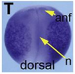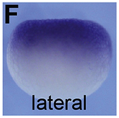 bcar3 (breast cancer anti-estrogen resistance 3) gene expression in Xenopus laevis embryo, assayed via in situ hybridization, NF stage 9, lateral view, animal up.