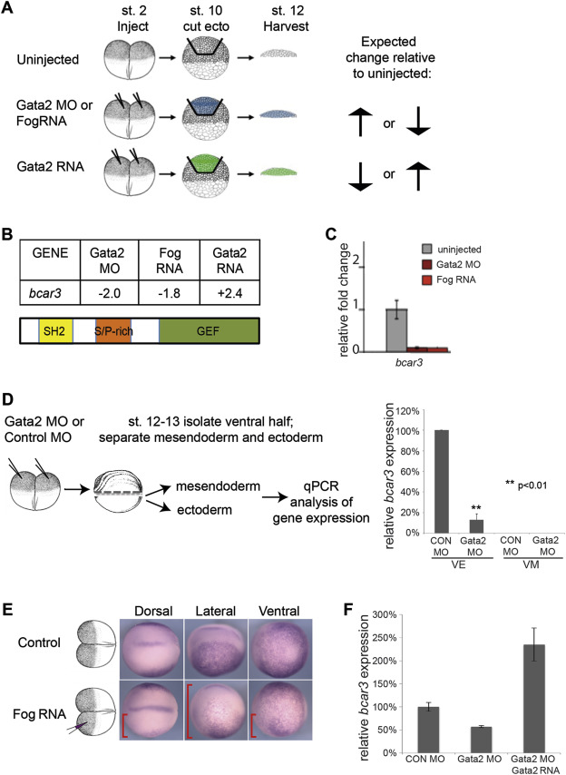 Identification of bcar3 as a target of Gata2 in ectoderm during gastrulation. (A) Schematic of strategy for microarray analysis and target gene identification. Gata2 MO (40 ng), Fog RNA (500 pg) or Gata2 RNA (500 pg) was injected into both cells of two-cell embryos and ectoderm was explanted when embryos reached stage 10. When sibling embryos reached stage 12, RNA was isolated from ectoderm for microarray analysis. Genes showing upregulation in Gata2 MO and Fog RNA injected embryos, and downregulation in Gata2 RNA injected embryos were identified as putative negative targets of Gata2. Genes showing downregulation in Gata2 MO and Fog RNA injected embryos, and upregulation in Gata2 RNA injected embryos were identified as putative positive targets of Gata2. (B) Table showing fold change in bcar3 expression relative to uninjected controls detected by microarray analysis and schematic diagram of Bcar3 structure, SH2: Src homology 2 domain, S/P-rich: Serine/Proline-rich domain, GEF: Guanine nucleotide exchange factor like domain. (C) qPCR analysis of bcar3 gene expression in ectodermal explants isolated at stage 10 from embryos that had been injected with Gata2 MO or Fog RNA and cultured to stage 12. The level of expression of bcar3 was normalized to that in ectoderm from uninjected controls. (D) Gata2 MO (40 ng) or control MO (40 ng) were injected into both cells of two-cell embryos and ventral ectoderm and ventral mesendoderm were dissected at stage 12â13. RNA was extracted from tissue from 10 pooled explants in three independent experiments and bcar3 gene expression was analyzed by qPCR. The level of expression of bcar3 was normalized to that in ectoderm from control MO injected embryos. VE: ventral ectoderm, VM: ventral mesendoderm, ND: not detected. (E) Fog RNA (500 pg) was injected into one cell of two-cell embryos and expression of bcar3 was examined at stage 15 using WMISH. Uninjected embryos were used as controls. In each row, dorsal, lateral and ventral views of the same embryo are shown. Brackets indicate the Fog RNA injected side. (F) Gata2 MO (40 ng), control MO (40 ng), or Gata2 MO (40 ng) and Gata2 RNA (1 ng) together was injected into both cells of two-cell embryos and ectoderm was explanted when embryos reached stage 10. When sibling embryos reached stage 12, RNA was isolated from ectoderm for qPCR analysis. The level of expression of bcar3 was normalized to that in ectoderm from control MO injected embryos.
