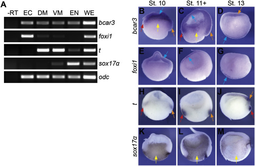 bcar3 is ubiquitously expressed at the onset of gastrulation but becomes restricted to prospective notochord and ventral ectoderm by the end of gastrulation (A) Semi quantitative RT-PCR was used to analyze expression of bcar3, foxi1, t, sox17α and odc (as a loading control) in equivalent amounts of RNA from whole embryos (WE) or from ectoderm (EC), dorsal mesoderm (DM), ventral mesoderm (VM) or endoderm (EN) dissected from embryos at stage 10. Reverse transcriptase was omitted from one set of samples (-RT) as a control for genomic contamination. (BâM) Expression of bcar3, foxi1, t and sox17α was analyzed by in situ hybridization of probes to bisected embryos at stage 10, 11 and 13. Stage 10 and 11 embryos are oriented with dorsal to the right and stage 13 embryos are oriented with dorsal to the top. Arrows indicate ectoderm (blue), dorsal mesoderm (orange), ventral mesoderm (red) and endoderm (yellow).