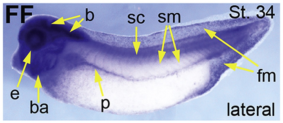 bcar3 (breast cancer anti-estrogen resistance 3) gene expression in Xenopus laevis embryo, assayed via in situ hybridization, NF stage 34, lateral view, anterior left, dorsal up.
