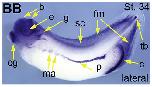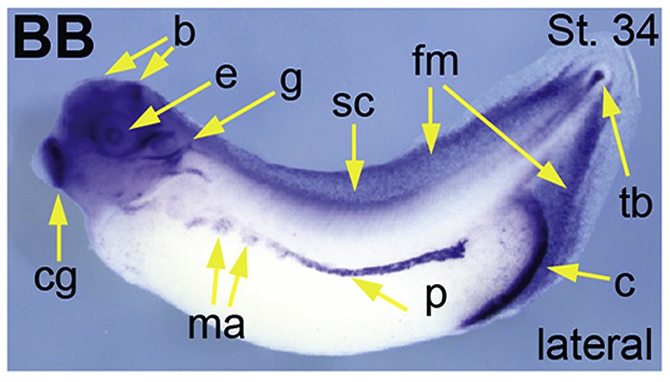 bcar1 (breast cancer anti-estrogen resistance 1) gene expression in Xenopus laevis embryo, assayed via in situ hybridization, NF stage 34, lateral view, anterior left, dorsal up.
