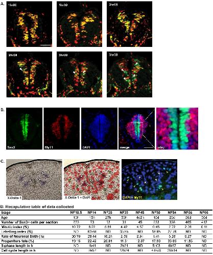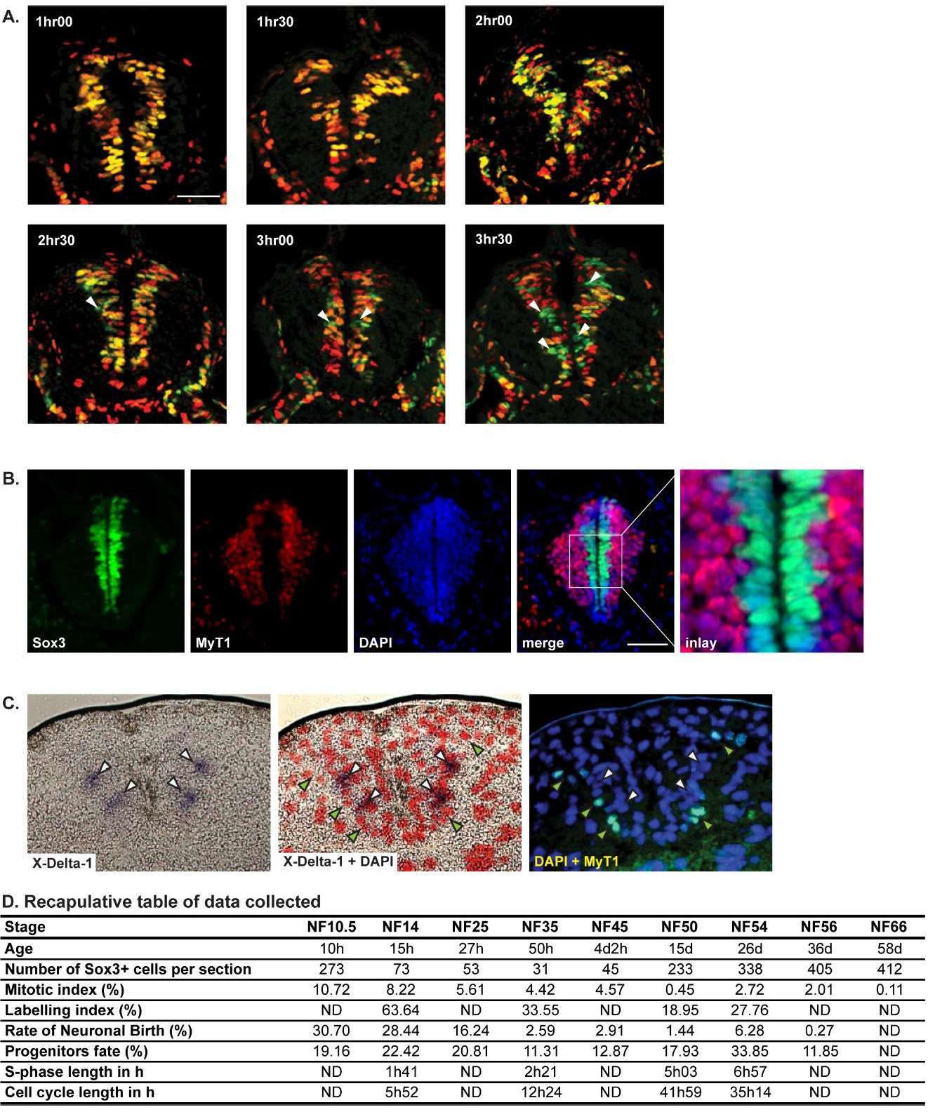 areas of expression of X-Delta-1. Green arrowheads indicate X-MyT1+ nuclei. MyT1 positive nuclei are close to the domain of expression of X-Delta-1 but do not overlap. D. Table compiling the various data