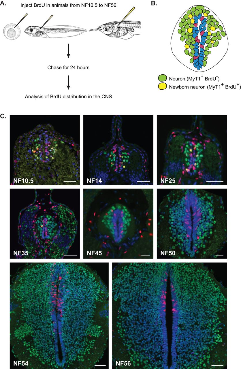 Neuronal birth during development. (A) Rationale of the birth dating experiment. Animals are injected with BrdU and kept for 24 h to allow BrdU incorporation and cell division to occur. (B) Schematic representation of spinal cord with identified cell populations. In a section of spinal cord, we can identify two categories of cells. (C) Fluorescent immunostaining against xMyT1 (green) and BrdU (red). Nuclei were counterstained with DAPI. Each developmental stage is indicated on the images. Scale bars=50 µm.
