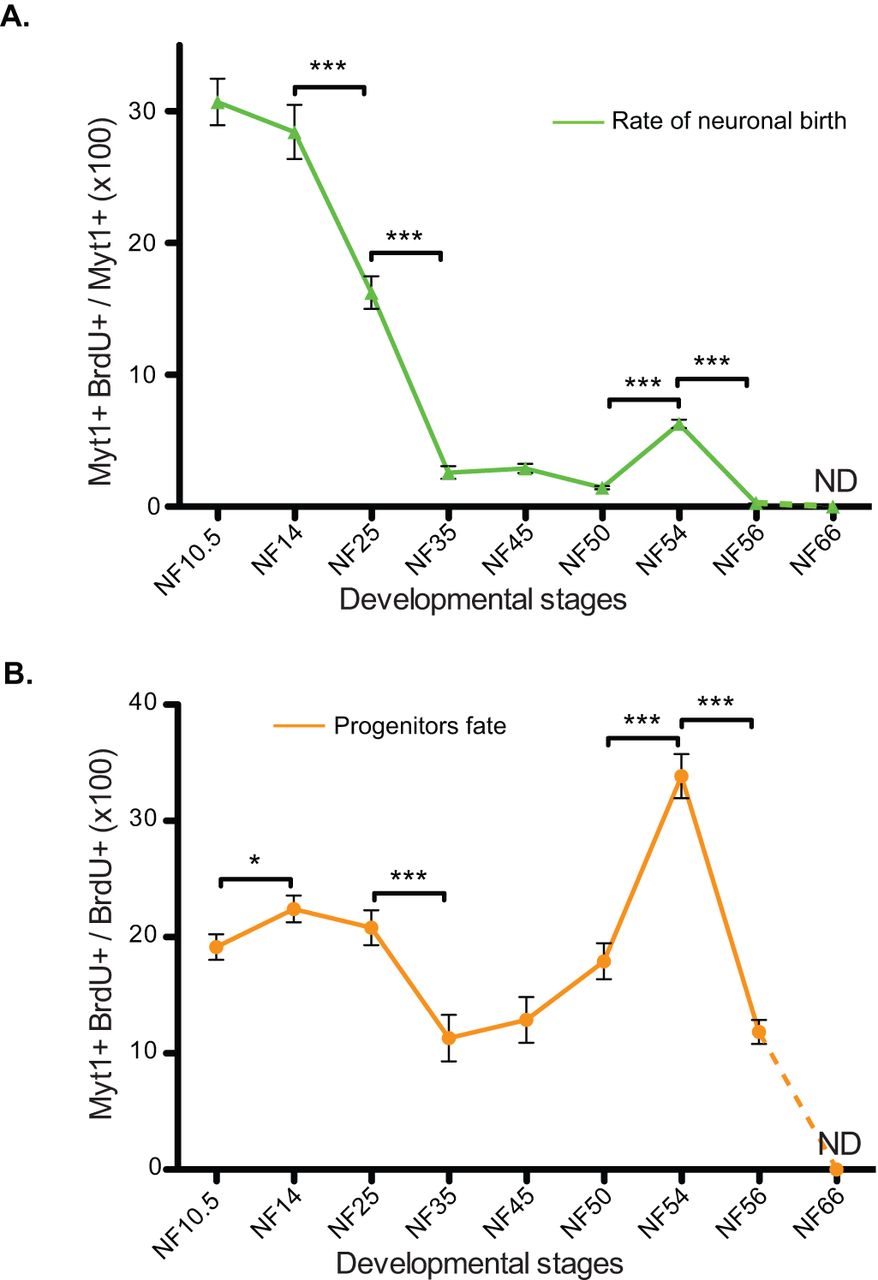 The behaviour of neural progenitors changes during development. The quantification of the birth dating results enables the estimation of two parameters according to the populations considered. Since mitotic index was negligible at NF66, no birth dating data have been collected for this stage and values have been extrapolated to 0 (dashed lines). (A) Rate of neuronal birth. This graph represents the percentage of BrdU-positive cells among the xMyT1-positive cells and corresponds to the proportion of newly born neurons appeared during the last 24 h. Two main phases of neuronal birth can be identified at NF14 and NF54. In between, the rate of newly born neurons is very low. After NF54, the rate of newly born neurons decreases again. (B) Progenitors fate. This diagram represents the percentage of xMyT1-positive cells among the BrdU-positive population and is an indication of the choice made by progenitors to stay in the cell cycle by proliferating or to exit the cell cycle by differentiating into neurons. Data represented as mean±s.e.m. ***P<0.001, *P<0.05.