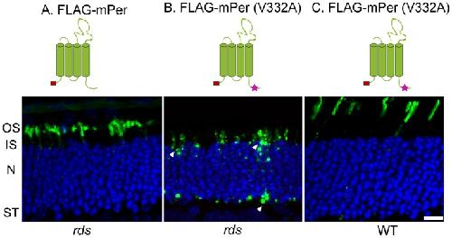 Figure 4. The V332A mutation abrogates peripherinâs outer segment targeting in rods of the rds mouse.(A) Wild type FLAG-tagged mouse peripherin (mPer) was electroporated into rods of the rds mouse and stained with anti-FLAG antibodies (green). (B) V332A FLAG-tagged peripherin electroporated into rods of the rds mouse; construct mislocalization to the inner segment and synaptic terminal is highlighted by white arrowheads. (C) V332A FLAG-tagged peripherin electroporated into the rods of wild type mice. The electroporated constructs are illustrated schematically above the corresponding panels with the position of the FLAG tag depicted in red. Note that the outer segment shapes in (A) and (C) are different due to ongoing photoreceptor degeneration in the rds mouse (A). Abbreviations are: OS â outer segment, IS â inner segment, N â nuclei, ST â synaptic termini. Nuclei (blue) are stained with Hoechst. Scale bar: 10 µm.