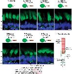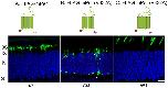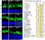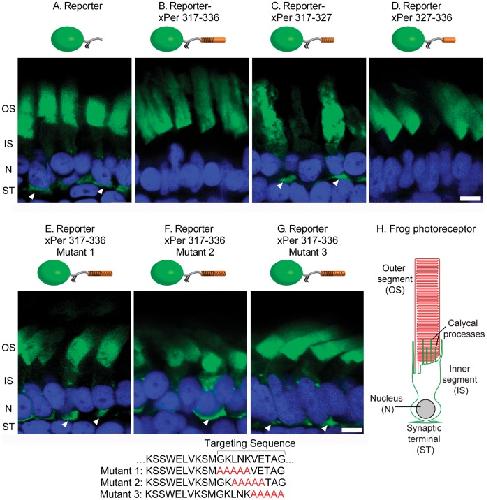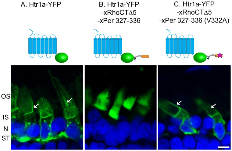 Figure 3. The peripherin targeting sequence redirects the subcellular targeting of the Htr1a serotonin receptor.Panels show confocal images of transgenic frog retinas expressing YFP-fused Htr1a constructs (green) schematically illustrated above each panel. (A) Htr1a-YFP; fluorescent signal observed in calycal processes is marked by white arrows. (B) Htr1a-YFP containing the Per327–336 sequence fused at the C-terminus. (C) Same construct as in (B), but bearing the V332A mutation. Abbreviations are: OS – outer segment, IS – inner segment, N – nuclei, ST – synaptic termini. Nuclei (blue) are stained with Hoechst. Scale bar: 5 µm.