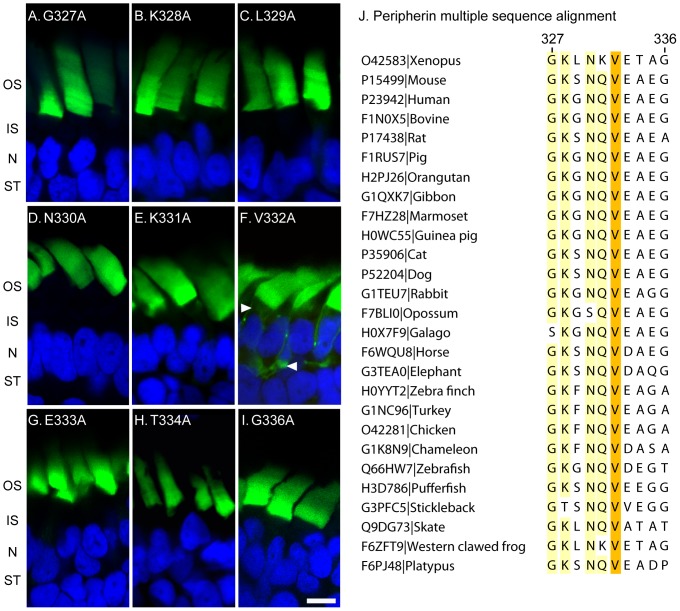 Figure 2. Alanine scanning mutagenesis of the peripherin targeting sequence identifies V332 as the only residue essential for targeting.Panels AâI show confocal images of transgenic frog retinas expressing the YFP-xRhoCTδ5-xPer317â336 (green) variations containing single alanine substitutions of individual residues. (J) Multiple sequence alignment of peripherin targeting sequences from different species; residues with over 90% identity are highlighted yellow and the 100% conserved valine is highlighted orange. Abbreviations are: OS â outer segment, IS â inner segment, N â nuclei, ST â synaptic termini. Nuclei (blue) are stained with Hoechst. Scale bar 5 µm.
