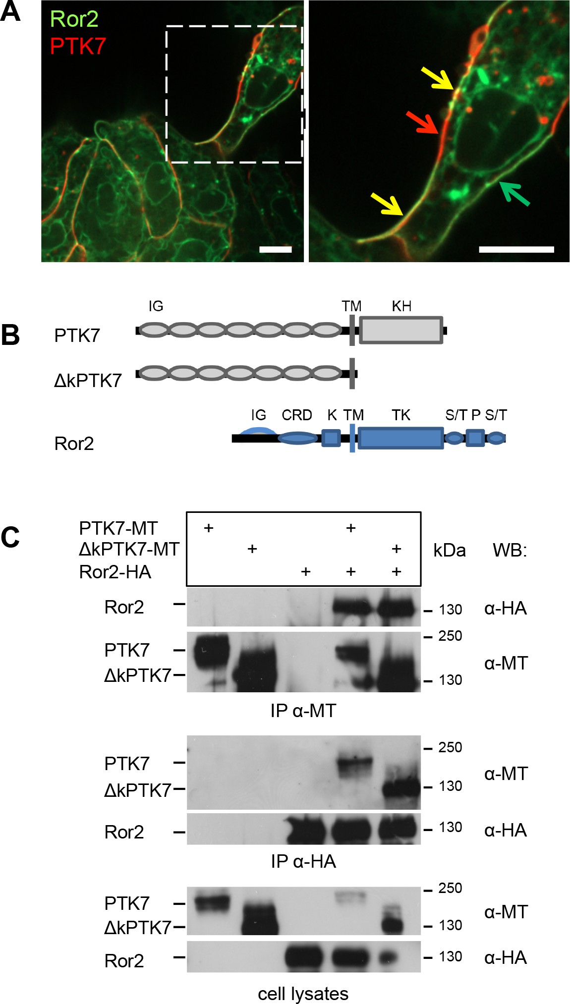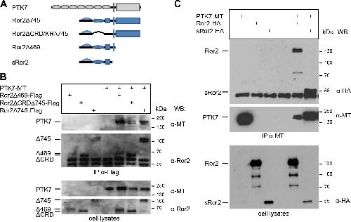 Fig 2. The intracellular domain and the CRD domain of Ror2 are not required for PTK7/Ror2 interaction. Myc-tagged PTK7 (PTK7-MT) together with FLAG- or HA-tagged Ror2 deletions were expressed in MCF7 cells. A The respective constructs and their protein domains are depicted in the top panel. B Immunoprecipitation using anti-FLAG antibodies; the cell transfection scheme is indicated at the top. Co-precipitated PTK7 was detected using anti-myc antibodies. Immunoprecipitated PTK7 is shown in the top panel, immunoprecipitated Ror2 constructs in the middle panel and cell lysates in the bottom panel. Antibodies used for Western blotting and molecular weights are indicated at the right. C Immunoprecipitation using anti-myc antibodies; the cell transfection scheme is indicated at the top. Co-precipitated full-length Ror2 and sRor2 were detected using anti-HA antibodies (top panel). Immunoprecipitated PTK7 is shown in the middle panel and cell lysates in the bottom panel. Antibodies used for Western blotting and molecular weights are indicated at the right. doi:10.1371/journal.pone.0145169.g002 |