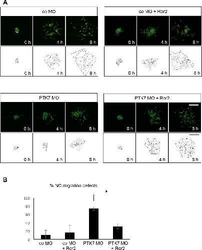 Fig 4. Ror2 rescues the PTK7 loss of function phenotype in explanted NC cells. A NC explants injected with 7.5 ng MO in combination with 50 pg mGFP RNA, 250 pg H2B-mcherry and 150 pg Ror2 RNA. Time-lapse images (upper panel) and Delaunay triangulations (lower panel) at the start of the experiment (0 h) and after 4 or 8 hours are shown for the different conditions. B Graph summarizing percentage of migration defects of 3 independent experiments (total of 39 explants). Standard error of the means are shown. Asterisks indicates a p-value in a Student’s t-test < 0.05. Scale bars = 200 μm. doi:10.1371/journal.pone.0145169.g004 |