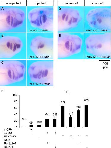 Fig 5. The kinase domain of Ror2 is required to rescue the NC migration defect in PTK7 morphant embryos. Xenopus embryos were injected with different constructs in combination with 100 pg LacZ RNA as a lineage tracer and analyzed by whole-mount in situ hybridization using a twist antisense RNA probe. A Embryo injected with 10 ng control MO and 100 pg GFP RNA shows normal NC migration. B Embryo injected with 10 ng PTK7 MO and 100 pg GFP RNA shows inhibition of NC migration on the injected side, while NC migration is normal on the uninjected side. C Co-injection of 10 ng PTK7 MO together with 100 pg Ror2 RNA rescues the NC migration defect. D Embryo injected with 10 ng PTK7 MO and 100 pg of Ror2δ469 RNA. The embryo shows a NC migration defect on the injected side. E Embryo injected with PTK7 MO and a kinase dead mutant of Ror2 (Ror2-3I) showing a NC migration defect on the injected side. F Graph summarizing the percentage of NC migration defects of a minimum of 5 independent experiments for each experimental condition. Asterisks indicates a p-value in a Studentâs t-test < 0.001. Scale bar = 500 μm. doi:10.1371/journal.pone.0145169.g005 |