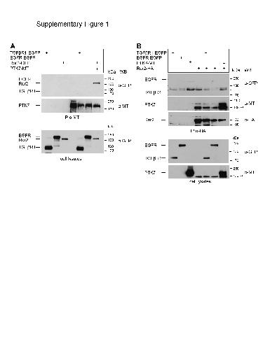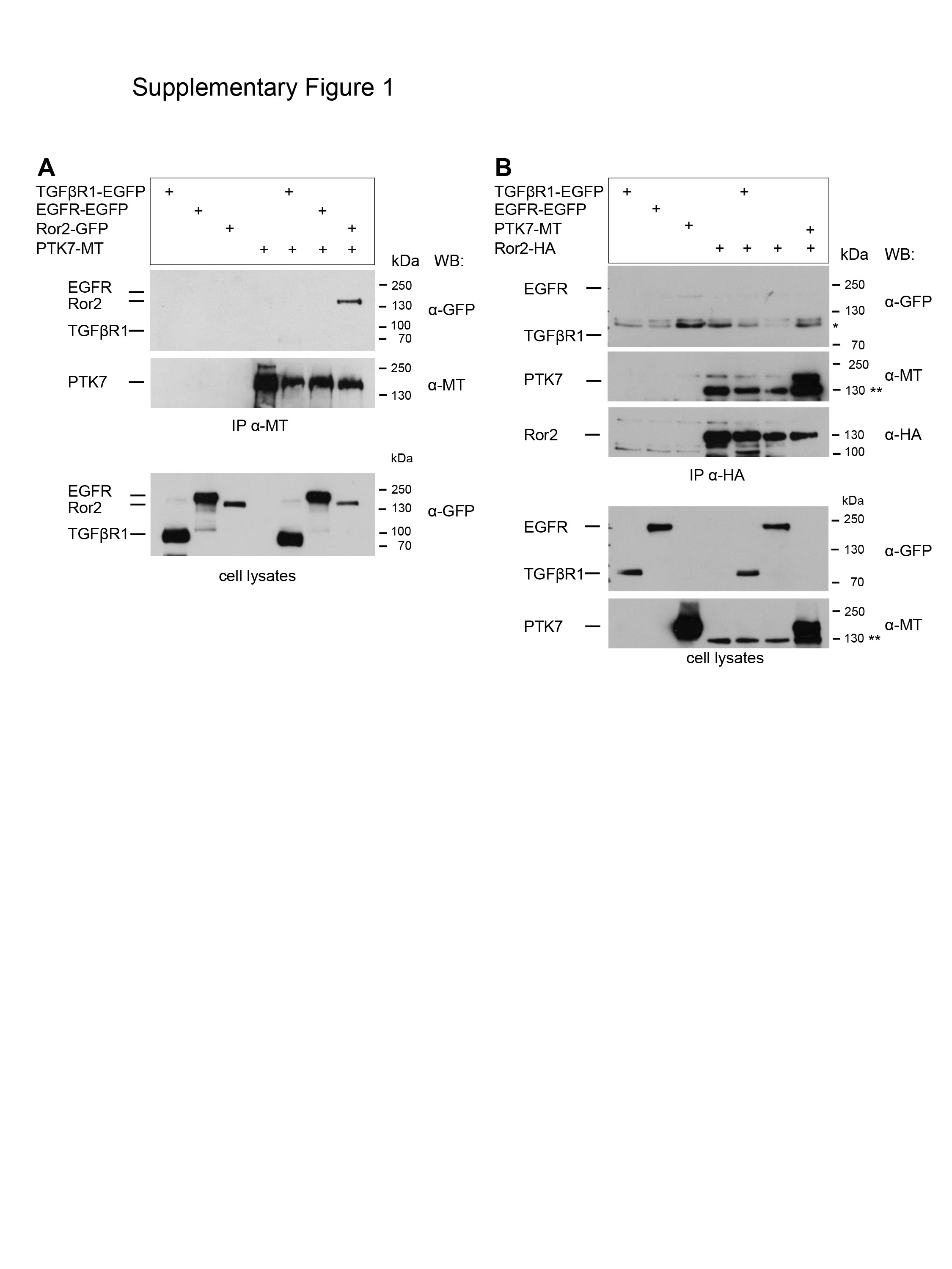 S1 Fig. PTK7 and Ror2 co-precipitate each other but not EGFR or TGFß1R. A Full-length myc-tagged PTK7 (PTK7-MT) was co-expressed with Ror2-EGFP, EGFR-EGFP [95] or TGFß1R-EGFP (kind gift of A. Menke, Molecular Oncology of Solid Tumors, Giessen, Germany) as indicated in MCF7 cells. Cell lysates were precipitated using anti-myc antibodies (IP α-MT, upper panel). Precipitates are shown in the upper panels, cell lysates in the lower panel. Antibodies used for Western blotting and molecular weights are indicated at the right. B Full-length HA-tagged Ror2 was co-expressed with PTK7-MT, EGFR-EGFP or TGFß1R-GFP as indicated in MCF7 cells and cell lysates were precipitated using anti-HA antibodies (IP α-HA, upper panel). Precipitates are shown in the three upper panels and lysates in the two lower panels. Antibodies used for Western blotting and molecular weights are indicated at the right; * marks unspecific bands, ** Ror2 signal remaining from previous anti-HA staining, which was only partially removed by blot stripping. doi:10.1371/journal.pone.0145169.s001 |