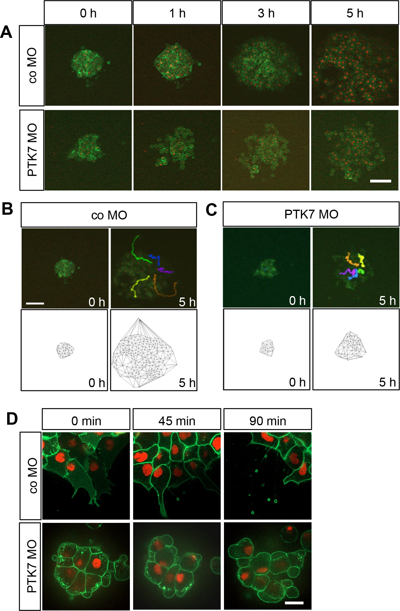 Fig 3. Loss of function of PTK7 affects NC cell shape and inhibits migration of explanted NC. A Time series showing explanted NC cells injected with 7.5 ng control or PTK7 MO in combination with 50 pg mGFP RNA and 250 pg H2B-mcherry. Cranial NC explants were excised at stage 16–17 and explanted on a fibronectin matrix and incubated until they had stably adhered to the matrix. NC migration was monitored for 5 hours using spinning disk microscopy (10x objective NA 0.45). Images for representative explants injected either with control or PTK7 MO are shown at the start of the experiment (0 h) or after 1, 3 or 5 hours; scale bar = 50 μm. B Cell tracking and Delaunay triangulation for explants injected with 7.5 ng co MO. The upper panel shows a single frame of the spinning disk movie and the lower panel the Delaunay triangulation at the start of the experiment (0 h) or after 5 hours. Cells were tracked over the whole five-hour time interval using the H2B staining of single nuclei. These tracks are shown for single cells as differently colored lines in the images taken after 5 hours, scale bar = 50 μm. C Cell tracking and Delaunay triangulation for explants injected with 7.5 ng PTK7 MO. D Time series showing explants injected with 7.5 ng co MO (upper panel) or 7.5 ng PTK7 MO (lower panel) at a higher magnification. Injected NC cells were explanted at stage 17, cultured for 1.5 hours and imaged with a 63x objective (NA 1.4); scale bar = 20 μm. Images are shown at the start of the experiment (0 min) and after 45 and 90 minutes. doi:10.1371/journal.pone.0145169.g003 |