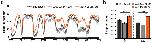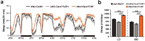 Figure 5. Pan-neuronal Ca-α1T knockdown increases sleep.(a) Sleep profiles of over two days of 12 h:12 h light-dark cycles (LD) and two days of continuous darkness (DD). Pan-neuronal knockdown of Ca-α1T (elav > Ca-α1T-IR, orange, n = 44) increases sleep beyond that of the heterozygous Gal4 control (elav-Gal4/+, black, n = 38) and the heterozygous UAS control (UAS-Ca-α1T-IR/+, grey, n = 42). Sleep is plotted in 30 minute intervals. White, black, and grey bars denote light phase, dark phase, and subjective light phase, respectively. ZT, zeitgeber time. CT, circadian time. (b) Quantification of average total sleep over two days of light-dark cycles (LD) and two days of continuous darkness (DD). Data are presented as means ± s.e.m. and analyzed via one-way ANOVA followed by the Tukey-HSD post hoc test. ***p < 0.001.