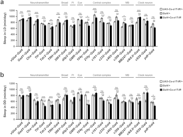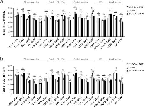 Figure 6. Knockdown of Ca-α1T in various neuronal subsets.(a) Average total sleep over two days of 12 h:12 h light-dark cycles (LD). (b) Average total sleep over two days of continuous darkness (DD). White, grey, and black bars denote UAS-Ca-α1T-IR/+, Gal4/+ and Gal4 > Ca-α1T-IR, respectively (n = 21–83). PI, pars intercerebralis, MB, mushroom body. Data are presented as means ± s.e.m. Statistical significance was determined using Welch’s ANOVA followed by the Games-Howell post hoc test. ns, not significant. *p < 0.05, **p < 0.01, ***p < 0.001.
