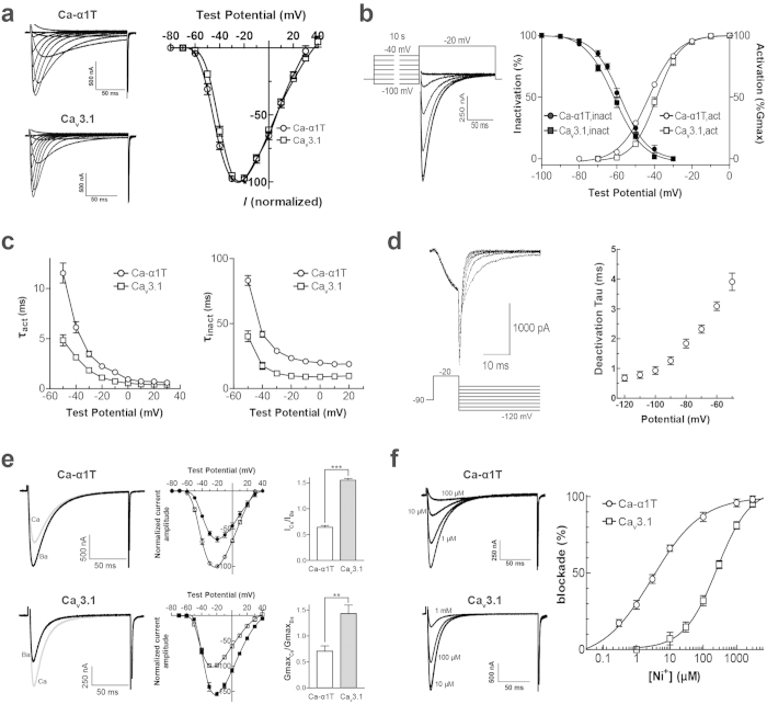Figure 1. Comparing the biophysical properties of Ca-α1T and rat Cav3.1.(a) (Left) Representative current traces through Ca-α1T and Cav3.1 expressed in Xenopus oocytes. In 10 mM Ba2+, currents were elicited by depolarizing 10 mV step pulses (−70 mV to +40 mV) from a holding potential of −90 mV. (Right) I–V relationships of Ca-α1T and Cav3.1. Peak currents for each oocyte were normalized to the maximum current. Percent amplitudes from oocytes expressing Ca-α1T (○) or Cav3.1 (⌜) plotted against test potentials and fitted with the Boltzmann equation. (b) (Left) Steady-state inactivation measured during voltage steps to −20 mV after 10 s prepulses to potentials between −100 mV and −40 mV. (Right) Voltage-dependent activation and steady-state inactivation curves of Ca-α1T (○, ●) and Cav3.1 (⌜, ■) fitted to the Boltzmann equation. (c) The activation (τact) and inactivation (τinact) time constants for Ca-α1T (○) and Cav3.1 (⌜) obtained by fitting the current traces to double exponentials. (d) Voltage-dependent deactivation of Ca-α1T in HEK-293 cells. Tail currents elicited by step pulses to −20 mV for 10 ms, followed by re-polarizing potentials (−120 mV to −50 mV). Deactivation time constants were obtained by fitting the traces to a single exponential and plotted against re-polarizing potentials. (e) ICa/IBa ratios of Ca-α1T and Cav3.1. (Left) Representative current traces through Ca-α1T and Cav3.1 measured in 10 mM Ba2+ or 10 mM Ca2+ elicited by 10 mV step pulses from a holding potential of −90 mV. Ba2+ currents are black; Ca2+ currents are grey. (Middle) I–V relationships of Ca-α1T (○, ●) and Cav3.1 (⌜, ■) in 10 mM Ba2+ (open) or 10 mM Ca2+ (filled). (Right) Peak current ratios (ICa/IBa) and relative slope conductance (GMaxCa/GMaxBa) for Ca-α1T and Cav3.1. Student’s t-test, **p < 0.01, ***p < 0.001. (f) Nickel inhibition sensitivity of Ca-α1T and Cav3.1. (Left) Representative current traces of Ca-α1T and Cav3.1 at various Ni2+ concentrations. (Right) Dose-response curves indicating Ni2+-dependent inhibition of Ca-α1T (○) and Cav3.1 (⌜). Data are presented as means ± s.e.m.