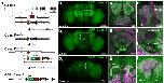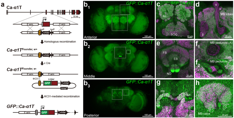 Figure 2. GFP::Ca-α1T expression in the adult brain.(a) Gene targeting and GFP::Ca-α1T generation strategy. Ca-α1T coding exons are red. (b) Adult brain expression of GFP::Ca-α1T (green) divided into maximal intensity projections of confocal stacks from the anterior (b1), middle (b2), and posterior (b3) brain. (c–h) GFP::Ca-α1T expression in specific neuropils whose location corresponds to the boxed areas in (b). (c) Expression in the antennal lobes (AL) and subesophageal ganglia (SOG). (d) Expression in the mushroom body (MB) lobes (α, β, and α’). (e) Expression in the fan-shaped body (FB), ellipsoid body (EB), and noduli (NO) of the central complex. (f) Expression in the (f1) anterior and (f2) posterior mushroom body (MB) peduncles. (g) Expression in the protocerebral bridge (PB) of the central complex. (h) Expression in the mushroom body (MB) calyx. Neuropils are counter-stained with the nc82 antibody (α-Bruchpilot, magenta).