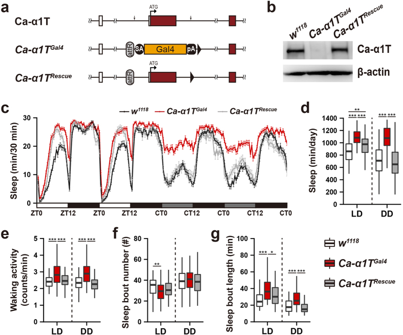 Figure 3. Sleep is increased in Ca-α1T mutants.(a) Ca-α1T, Ca-α1TGal4, and Ca-α1TRescue schematics. Ca-α1T coding exons are red. Downward arrows denote the extent of the deleted region. SA, splice acceptor. pA, polyA sequence. (b) Western blot analysis of Ca-α1T protein levels of fly head lysates. Ca-α1T is undetectable in Ca-α1TGal4 lysates while Ca-α1TRescue lysates show levels similar to the w1118 control. β-actin was used as a loading control. (c) Sleep profiles of w1118 (black, n = 89), Ca-α1TGal4 (red, n = 92) and Ca-α1TRescue (grey, n = 61) over two days of 12 h:12 h light-dark (LD) and two days of continuous dark (DD) conditions. Sleep is plotted in 30 minute intervals. Data are presented as means ± s.e.m. White, black, and grey bars denote light phase, dark phase, and subjective light phase, respectively. ZT, zeitgeber time. CT, circadian time. (d) Total daily sleep under LD and DD conditions. (e) Waking activity under LD and DD conditions measured as total activity counts divided by waking minutes. (f) The number of sleep bouts under LD and DD conditions. (g) Average sleep bout length under LD and DD conditions. Boxplot whiskers extend to the highest and lowest values that fall within 1.5× IQR of the upper and lower quartiles. All indications of statistical significance were determined using Welch’s ANOVA followed by the Games-Howell post hoc test. *p < 0.05, **p < 0.01, ***p < 0.001.
