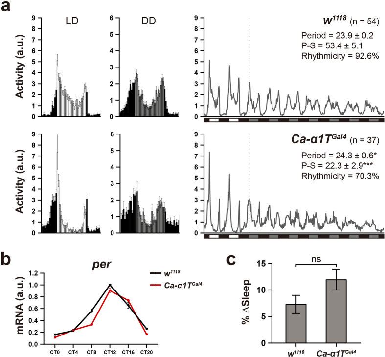 Figure 4. Ca-α1TGal4 flies show rhythmic locomotion and homeostatic regulation of sleep.(a) Average activity profiles from day 2 of the 12 h:12 h light-dark cycles (LD, left), day 2 of continuous darkness (DD, middle), and from throughout the experiment (2 LD + 7 DD, right). In the left and middle panels, data are presented as means ± s.e.m. In the right panel, white, black, and grey bars indicate light phase, dark phase, and subjective light phase, respectively. The dotted line indicates the beginning of constant darkness. The number of flies measured, their rhythmic period, their power of rhythmicity (P-S), and the percentage of rhythmic flies (Rhythmicity) are indicated. a.u., arbitrary unit. The Mann-Whitney U test was used to determine the significance of the period changes (*p < 0.05), while Welch’s t-test was used for rhythmic power (***p < 0.001). (b) Transcriptional oscillation of the period gene in Ca-α1TGal4 under DD conditions. Black and red lines denote w1118 and Ca-α1TGal4, respectively. rp49 was used for normalization. a.u., arbitrary unit. (c) Percentage of lost sleep recovered (% Δ Sleep) over a 12 hr period after 24 hours of mechanically-induced sleep deprivation. w1118 (n = 35) and Ca-α1TGal4 (n = 33). Statistical significance was determined using the Student’s t-test. ns, not significant. Data are presented as means ± s.e.m.