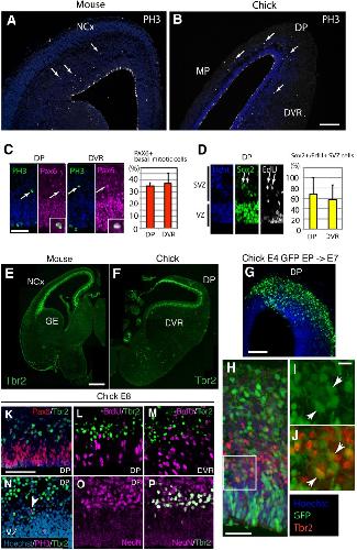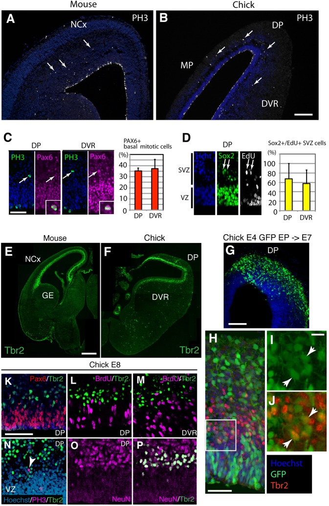 cells in the developing chicken pallium. (A,B) Distribution of phosphorylated histone H3 (PH3)+ cells in the developing mouse (A, E15.5) and chick (B, E8) telencephalon. Arrows indicate mitotic cells on the basal side of the pallia. (C,D) The proportion of the PH3+ cells that were also Pax6+, Sox2+ or EdU+ on the basal side of the chicken pallium. Arrows, indicate PH3+/Pax6+ cells (C, magnified by insets) and Sox2+/EdU+ cells (D). Mean±s.d. (E,F) Distribution of Tbr2+ cells in the developing mouse (E, E12.5) and chick (F, E8) telencephalon. (G-J) Labeling of Tbr2+ cells by electroporation (EP) with a GFP expression vector. Electroporation was performed at E4 and the chick embryos were collected at E7. Arrowheads (I,J), GFP+/Tbr2+ cells. (K-P) Characterization of Tbr2+ cells in the developing chick pallium. The sections were stained with anti-Pax6 (K), anti-BrdU (L,M), anti-PH3 (N) or anti-NeuN (O,P) antibodies and an anti-Tbr2 antibody. Arrowhead (N), a PH3+ cell that does not overlap with Tbr2. DP, dorsal pallium; DVR, dorsal ventricular ridge; MP, medial pallium; NCx, neocortex; GE, ganglionic eminence; SVZ, subventricular zone; VZ, ventricular zone. Scale bars: 200 µm in B (for A,B), E (for E,F), G; 50 µm in C (for C,D), K (for K-P); 10 µm in I (for I,J).