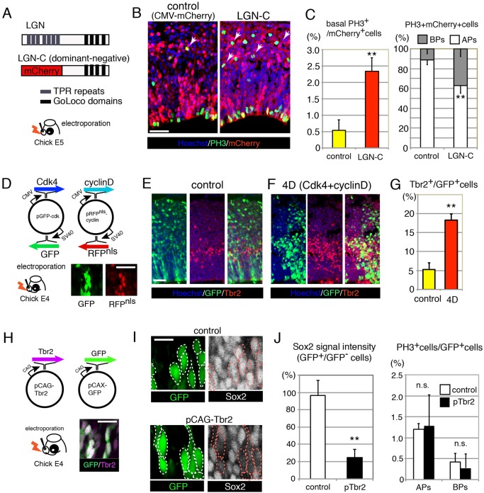 Fig. 3. Experimental amplification of basal mitotic cells and Tbr2+ cells in the developing chick pallium. (A) Diagram of the LGN and LGN-C proteins. C-terminal TPR repeats were replaced with mCherry in LGN-C. (B,C) LGN-C increased the number of PH3+ cells on the basal side of the chicken pallium at the expense of APs (arrowheads in B). (D-G) Overexpression of Cdk4 and cyclin D1 (collectively 4D) in the developing chick pallium. (D) The structures of the 4D vectors. Co-expression of GFP and RFP in the same cells was induced by electroporation of 4D vectors. (E-G) Overexpression of 4D vectors increased the number of Tbr2+ cells. (H-J) Overexpression of Tbr2 in the developing chicken pallium. (H) Structure of the expression vectors containing GFP and Tbr2. GFP and Tbr2 were co-expressed in the same cells upon electroporation. (I,J) Overexpression of Tbr2 suppressed Sox2 expression in APs but did not change the number of APs and BPs. All bar charts show mean±s.d. **P<0.01 (Student's t-test); n.s., not significant. Scale bars: 50 µm in B,E (for E,F); 25 µm in D; 15 µm in H; 10 µm in I.