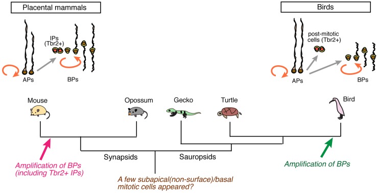 Fig. 5. A possible scenario of changes in pallial progenitor subtypes during amniote evolution. In mammals, apical progenitors (APs) proliferate and generate basal progenitors (BPs), which include Tbr2+ intermediate progenitors (IPs) and other types of BPs [such as basal radial glial cells (bRGs)]. In birds, both BPs and Tbr2+ cells exist, but these cells are distinct populations. We propose that a few subapical mitotic cells that have already evolved in ancestral amniotes are at the origin of BPs, although de novo BPs appeared in several taxa independently.