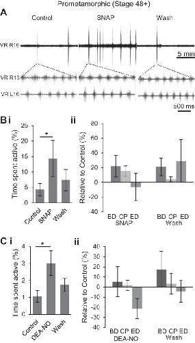Fig. 5. NO donors increase the occurrence of spontaneous locomotor activity at pro-metamorphic stages. A: VR recording from a stage 54tadpole both prior to, and during, NO donor [S-nitroso-N-acetyl penicillamine (SNAP), 200 μM] application and then following washout with expanded excerpts of L/R alternating VR (L/R 16) bursting during fictive swimming in each condition. Bi: pooled data showing the mean percent time spent active in each condition (n = 13). Bii: pooled data from the same preparations [as illustrated in expanded excerpts in A showing mean BD, CP, and ED (see Fig. 3Aii)] relative to control values during and after SNAP application. C: same pooled data analyses as in B, but for application of a different NO donor, DEA-NO (50â200 μM; n = 14). Values are means ± SE. *P < 0.05.