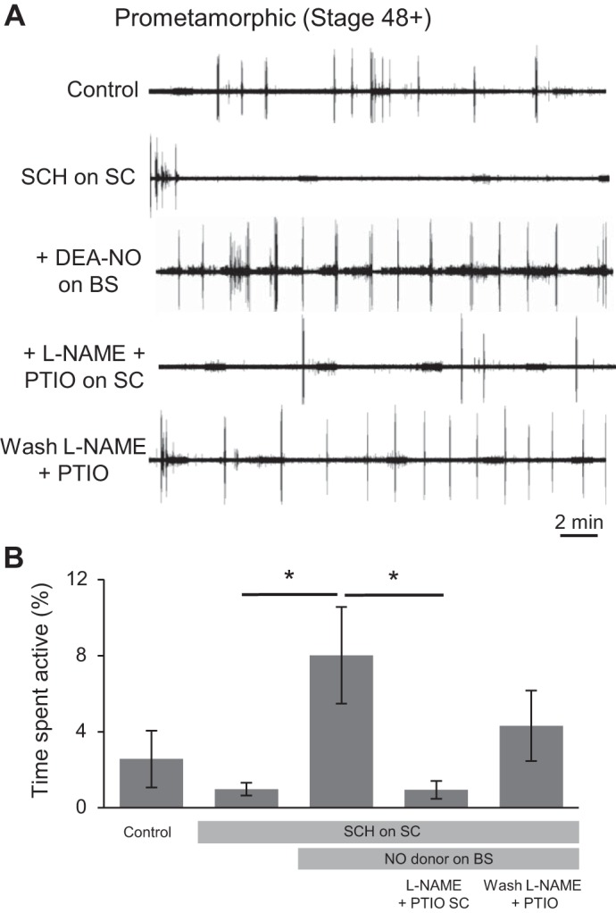 Fig. 8. NO's activation of the locomotor CPG via the BS is independent of spinal DA1 receptors, but requires endogenous spinal NO. A: VR recording (VR R18) from a stage 55tadpole showing spontaneous locomotor activity expression during CNS region-specific application of the DA1 receptor antagonist SCH-23390 (SCH; 50 nM), DEA-NO (200 μM), PTIO (100 μM) and l-NAME (1 mM). NB: the regular low-level activity evident in these traces is nonphysiological noise from the Peltier cooling system. B: pooled data of the time spent active during the successive drug applications (n = 6). Values are means ± SE. *P < 0.05.