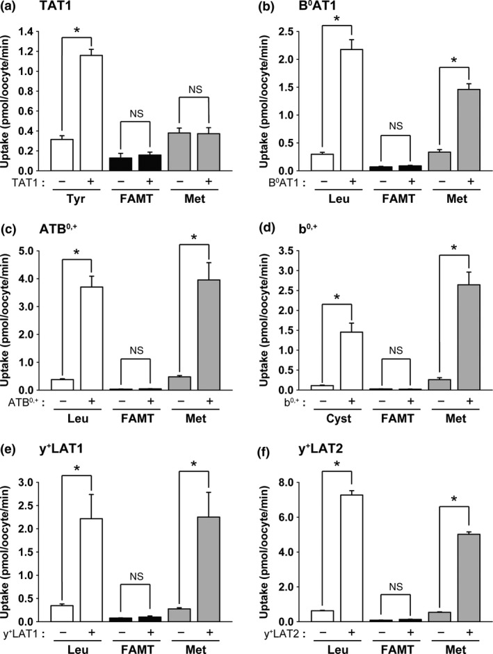 LAT2 (f), and the uptakes of 50 μM l‐[14C]cystine (Cyst), [14C]FAMT (FAMT) and l‐[14C]methionine (Met) by b0,+ (d) were measured on the control oocytes (“−”) and the oocytes expressing each transporter (“+”). For the functional expression of b0,+ in (d), rBAT, an auxiliary subunit of system b0,+ transporter strongly inducing system b0,+ activity in Xenopus oocytes, was expressed in Xenopus oocytes, therefore, the induced system b0,+ activity was not that of human but of Xenopus although human rBAT was expressed.16