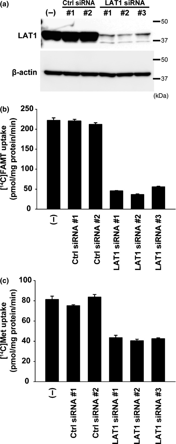 Figure 4. Effect of LAT1 knockdown on the uptake of [14C]FAMT and l‐[14C]methionine in HeLa S3 cells. HeLa S3 cells were transfected with LAT1 siRNA (LAT1 siRNA#1, #2, #3) or non‐targeting control siRNA (Ctrl siRNA#1, #2) and compared with non‐treated control (“(−)”). Knockdown of LAT1 with siRNA highly reduced LAT1 protein level in HeLa S3 cells in western blot (a). Accordingly, [14C]FAMT uptake was decreased by the treatment with LAT1 siRNA (b). The uptake of l‐[14C]methionine (Met) was also reduced, although the reduction of [14C]methoinine uptake by LAT1 knockdown was less than that of [14C]FAMT uptake (c). Control siRNA did not affect the levels of LAT1 protein and the uptake of [14C]FAMT and l‐[14C]methionine (a–c).