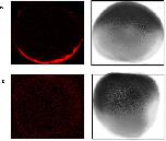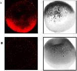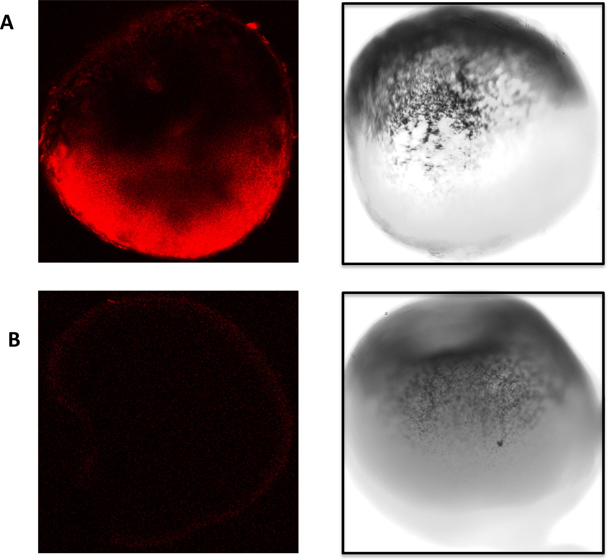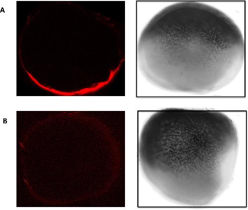 (A) Whole-mount in-situ hybridisation was performed in Xenopus laevis stage IV and V oocytes. The oocytes were stained with an Alexa Fluor® 647 goat anti-mouse antibody which recognises the mouse anti-biotin antibody which recognises the biotin in the LNA probe. Confocal images at 644 nm are shown (left panel) alongside light microscopy images (right panel). (B) No signal was detected in the control samples when no primary antibody was used. Again confocal images are presented to the left and light microscopy images on the right.