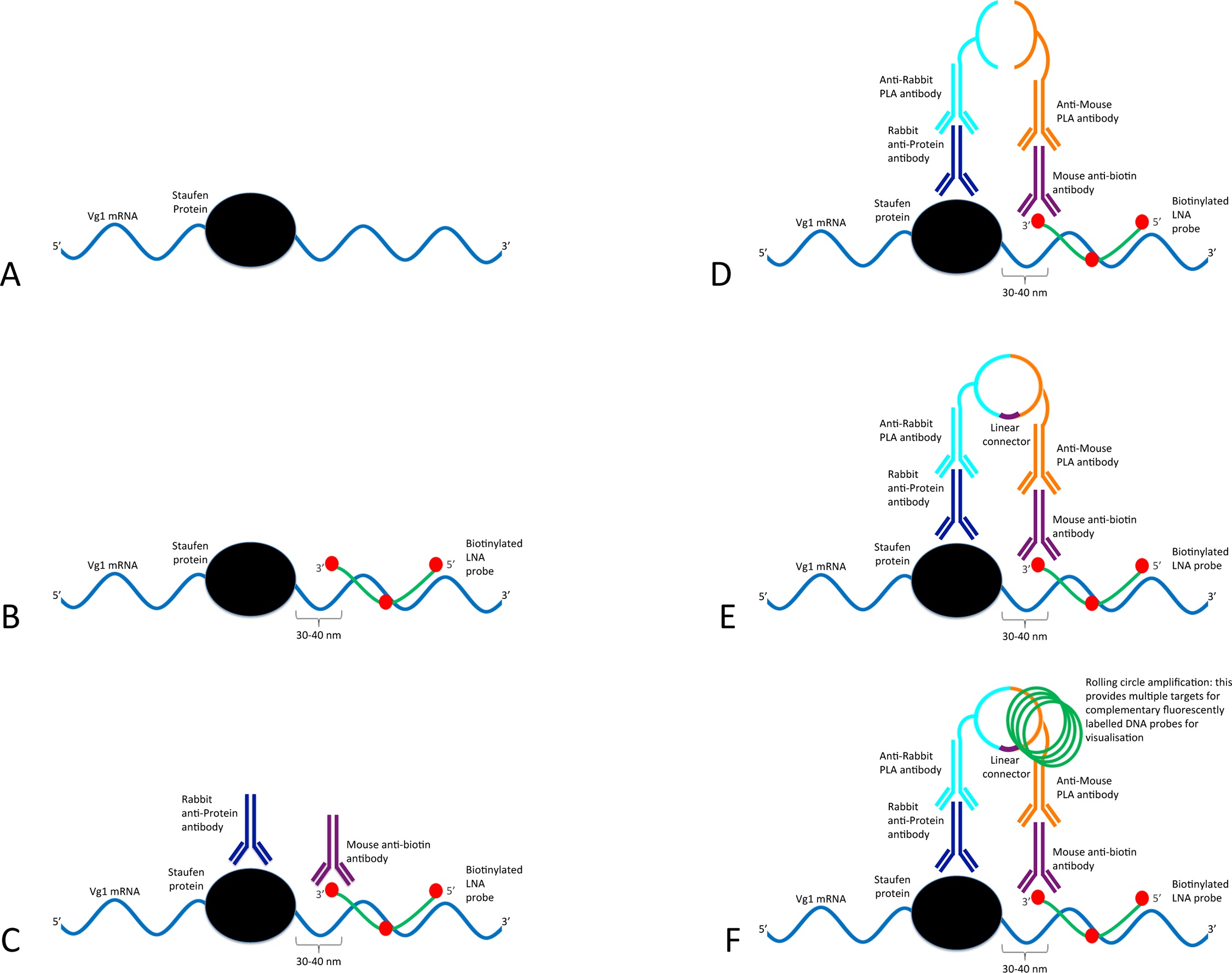 The ISH-PLA technique has been developed for the analysis of the co-localisation of protein complexes and specific DNA sequences. In this paper the method is adapted for RNA. (A) In vivo interaction of Vg1 mRNA (blue) with Xenopus Staufen (black). (B) In the first step a biotinylated LNA probe (green with biotin indicated in red) targets a specific RNA sequence close to the binding site of XStau1 in the Vg1 mRNA is added (see results section for details on LNA probe design). (C) Two primary antibodies raised in different species are added. In this case a rabbit antibody (dark blue) targets the XStau1 and a mouse antibody (purple) targets the biotin label in the LNA probe. (D) Two secondary PLA species-specific antibodies (light blue and orange) conjugated to oligonucleotides are then added. Since the LNA probe and the protein are in close proximity the secondary antibodies and their conjugated oligonucleotides are consequently also in close proximity. (E) The conjugated oligonucleotides are joined and circularised by DNA ligation upon introduction of linear connector oligonucleotide (dark purple). (F) The two oligonucleotides then commence rolling circle replication (the amplified circular DNA molecule is annotated in green). After the amplification reaction, fluorescent labelled complementary oligonucleotide probes are added to highlight the product.