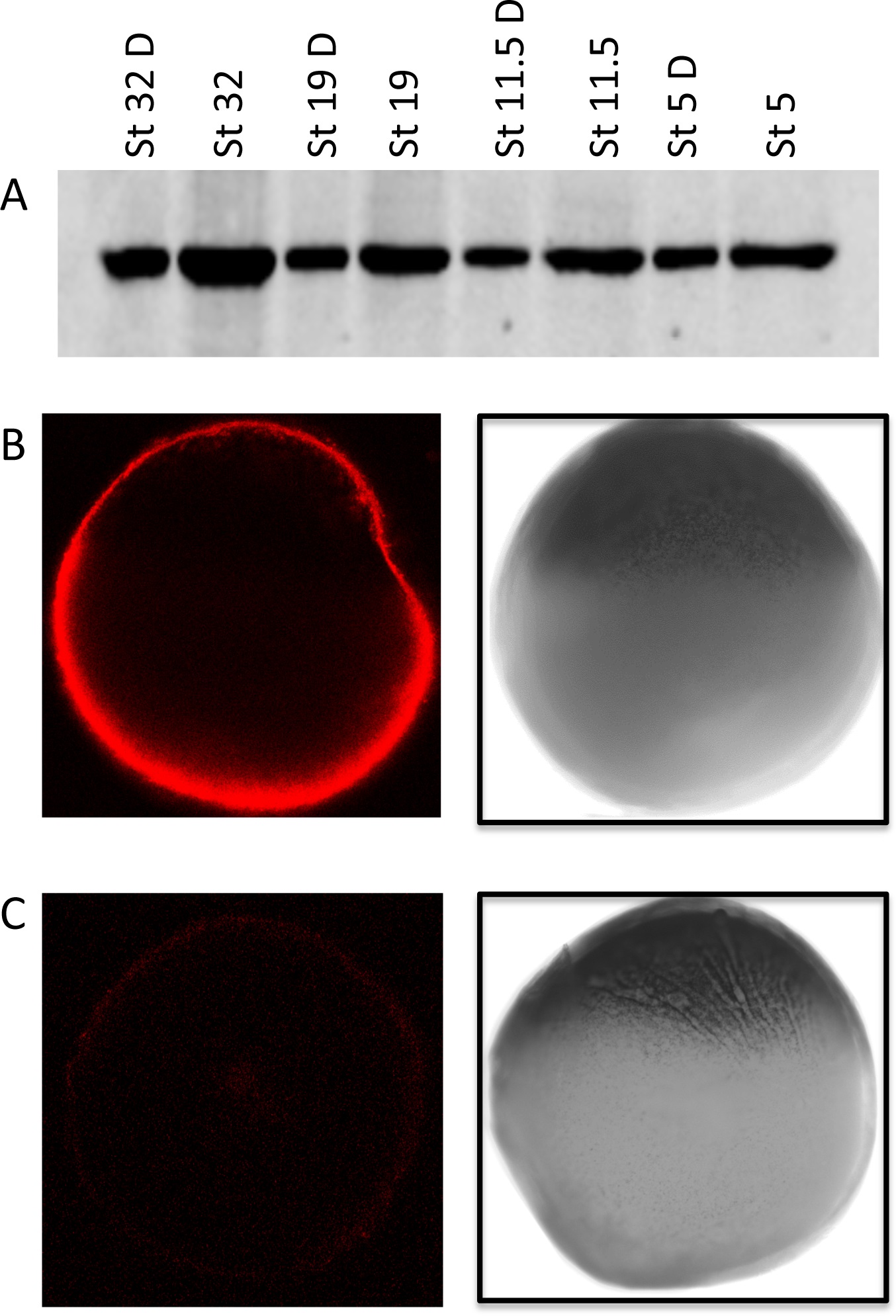 (A) Protein was prepared from Xenopus laevis embryos at stages 5â32 and yolk removed from the extraction; protein corresponding to one or a half (D) oocyte equivalents was separated by 12% SDS-PAGE and transferred to a nitrocellulose membrane prior to probing with a staufen specific antibody. A single, strong band of 80 kDa, corresponding to the molecular weight of staufen was detected. (B) Whole-mount Immunohistochemistry was performed on Xenopus laevis oocytes stage IV and V using the anti-Staufen antibody. The oocytes were visualised with Alexa Fluor® 647 donkey anti-rabbit antibody, which recognises the rabbit anti-XStau1 antibody, and photographed by confocal microscopy at 644 nm (left panel) and also by light microscopy (right panel) to identify the vegetal pole. (C) No signal was detected in the control samples where no primary antibody was present; the confocal image is shown on the left panel and light microscopy image on the right.