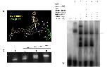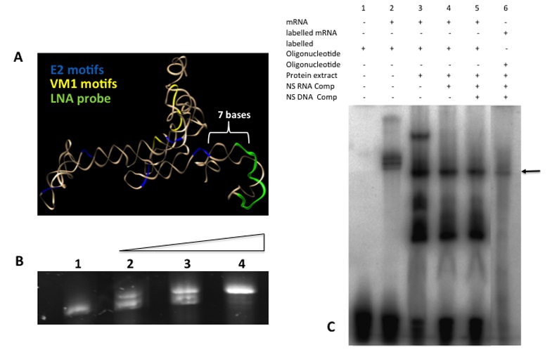 (A) The predicted 3D structure of the Vg1 mRNA 3’ UTR with the E2 motifs (blue), VM1 motifs (yellow) highlighted. The LNA probe (green) was designed to hybridise seven bases away from the last 3’ E2 motif, in close proximity to the predicted binding site of the protein complex that includes the Stau1 protein. (B) Syber gold stained EMSA, lane 1 control 3’UTR Vg1 mRNA (60nM). Lanes 2–5, increasing titration of the probe sequence DNA analogue: 30, 60 and 300 nM. (C) EMSA using acrylamide gel analysis. Lane 1, radiolabelled DNA probe sequence alone; lane 2–5 contain probe and 600 nM in vitro transcribed Vg1 3’UTR; Lane 3 in addition contains one oocyte equivalent of protein extract; lanes 4 and 5 are as lane 3 but with the addition of RNA and DNA non-specific competitors respectively. Lane 6 contains radiolabelled in vitro transcribed Vg1 3’ UTR in the presence of unlabelled probe sequence and one oocyte equivalent total protein extract along with DNA and RNA competitors.