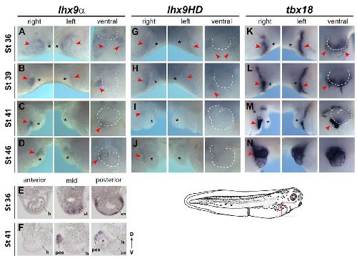 Fig. 1. Spatio-temporal analysis of lhx9 isoforms during Xenopus epicardial development. Whole embryo in situ hybridization was performed on Xenopus embryos at stages 36 to 46, using probes specific for lhx9-α (A-D), lhx9-LIM (E,F), lhx9-HD (G-L) and tbx18 (K-N) (see also Figs S2-S5). Views display embryos facing right, left and ventral with anterior to the top. Images show magnified cardiac regions as depicted by red box on tadpole schematic (bottom right). Red arrowheads indicate staining of septum transversum and PE clusters. Asterisks indicate cardiac region. White dashed line outlines heart in ventral views. (E,F) Transverse gelatin section in situ hybridization images of cardiac region demonstrate lhx9-LIM expression exclusively in the septum transversum (stage 36) and proepicardial tissue (stage 41). en, anterior endoderm; h, heart; peo, proepicardial organ; st, septum transversum. |