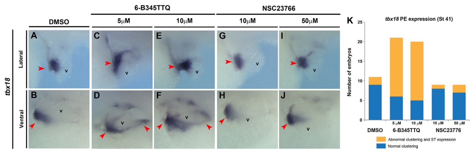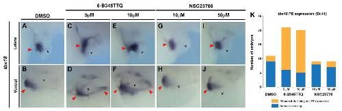 Fig. 3. Integrin-paxillin association is required for PE clustering. In situ hybridization for tbx18 on whole embryos after incubation in stated concentrations of small molecules between stages 38 and 41. Lateral views (A,C,E,G,I) and ventral views (B,D,F,H,J) of the cardiac region from representative embryos are shown; red arrowheads indicate PE cells. (C-F) Images depict maintained tbx18 expression on septum transversum and clustering abnormalities as shown in Fig. 2M when embryos are incubated in 6-B345TTQ. (K) tbx18 expression in embryos taken from two independent experiments; P=0.000248 by Chi-square test. v, ventricle. |