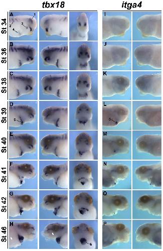 Figure S3. Spatio-temporal analysis of tbx18 and itga4 during Xenopus embryogenesis. (A-H) In situ hybridization of tbx18 showing right, left and ventral views of wild-type embryos from stage 34 to 46, anterior region of embryo. (I-P) In situ hybridization of itga4 showing right and left views of anterior region from stage 34-46. 1; cranial mesoderm, 2; somites, 3; branchial arches, 4; septum transversum, 5; proepicardial cluster, 6; epicardium. |